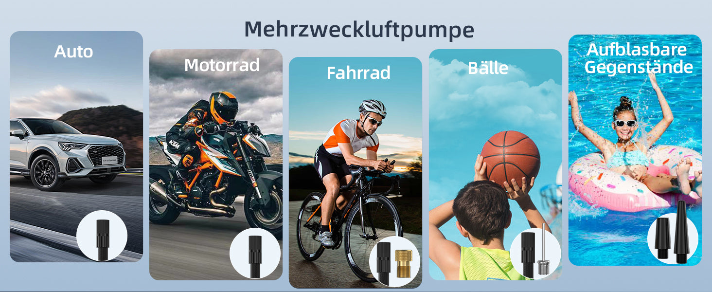 Der EBOSSOM Reifenfüller erreicht einen maximalen Druck von 10,3 bar. Er eignet sich zum Aufpumpen einer Vielzahl von Gegenständen, darunter Autoreifen, Motorradreifen, Fahrradreifen, Sportbälle und Schwimmringe.