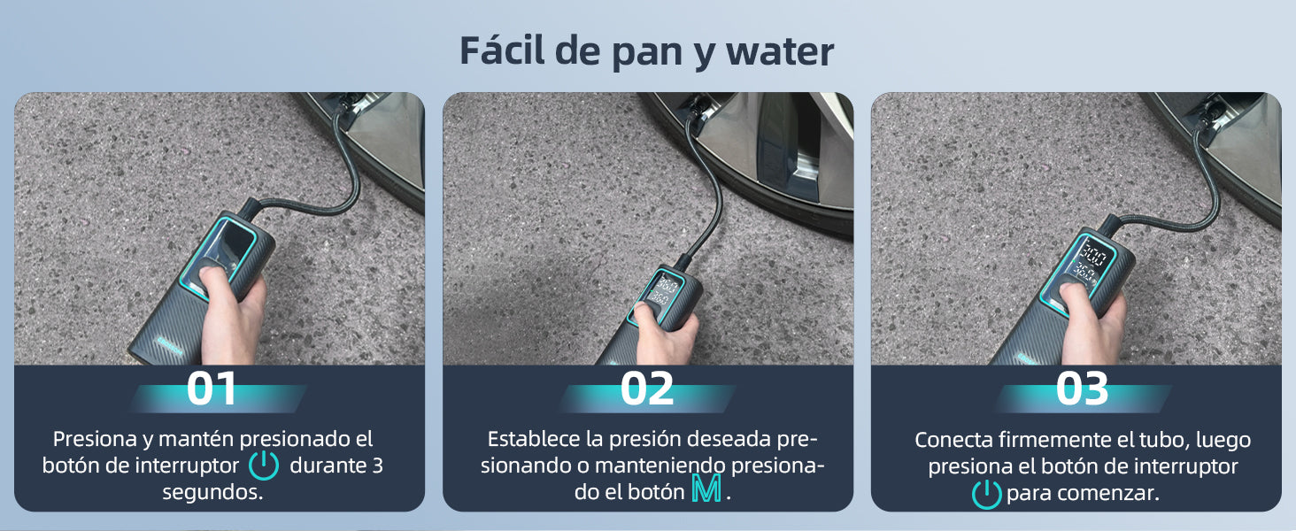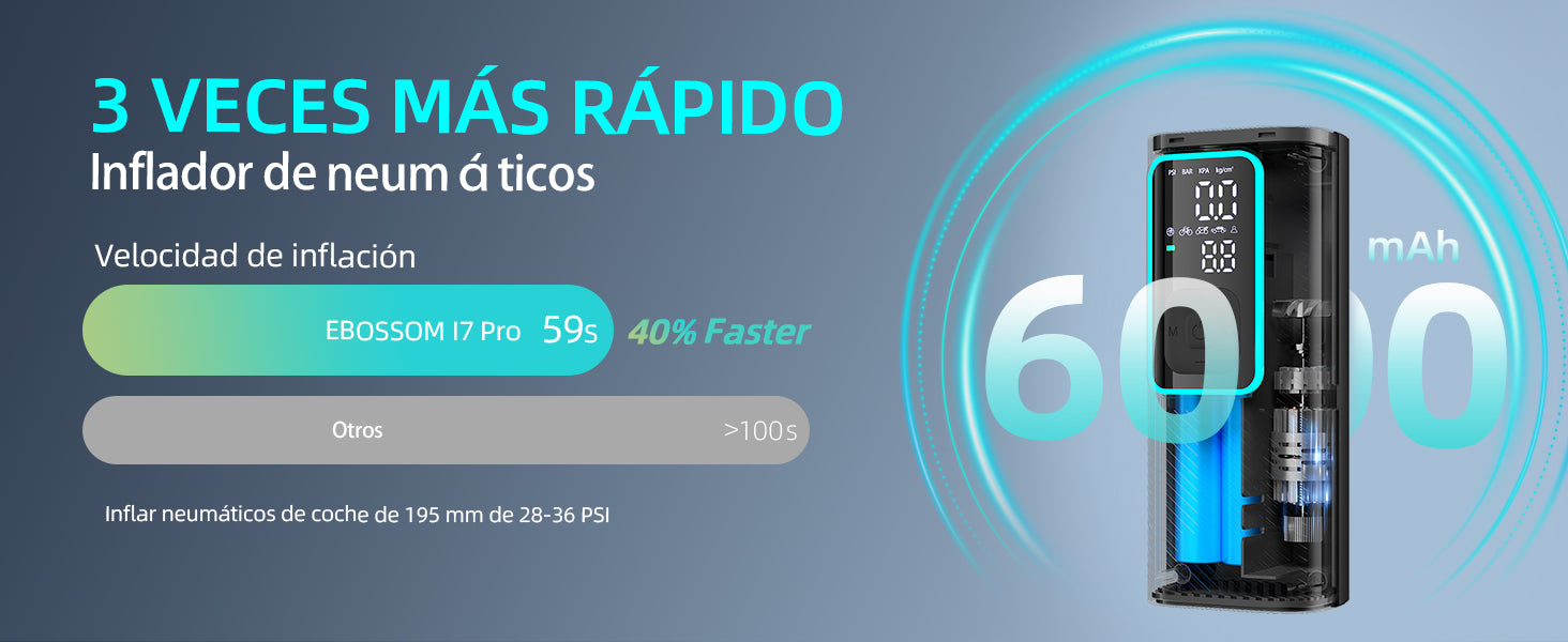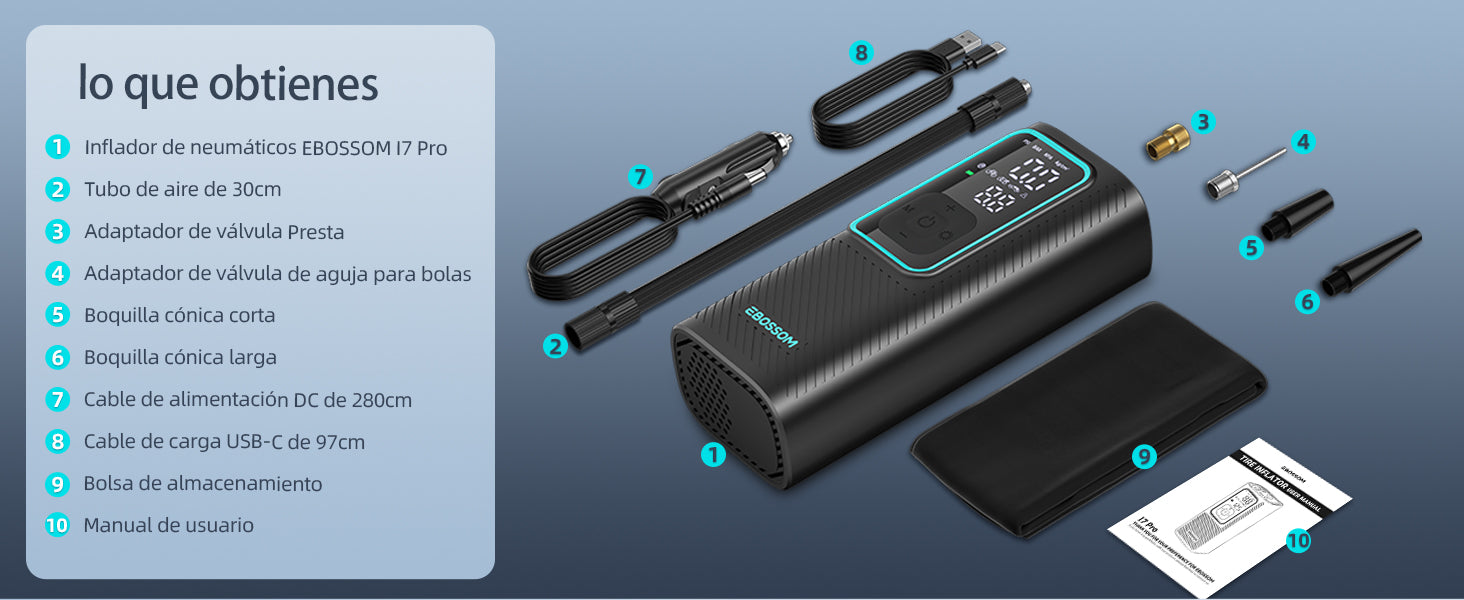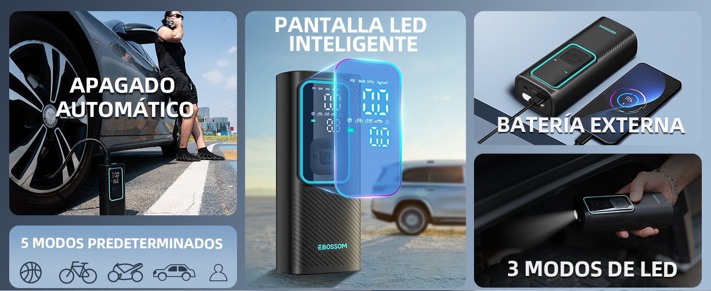 Sí, el inflador de neumáticos EBOSSOM I7 Pro se puede alimentar directamente a través del encendedor de tu coche (enchufe 12V). Esto es especialmente útil cuando la batería interna está descargada o si prefieres no depender de la batería.