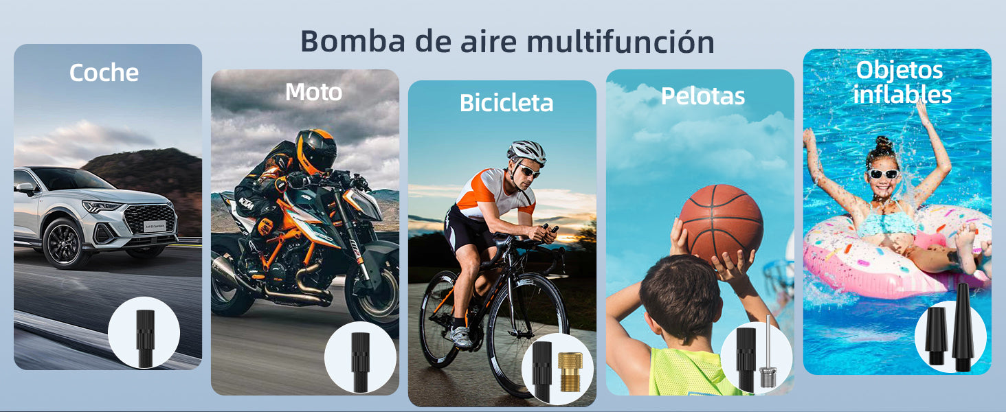 NO ADECUADO PARA OBJETOS INFLABLES DE GRAN VOLUMEN: Esta mini bomba de aire está diseñada para alta presión y no es adecuada para objetos inflables de gran volumen como: tablas de paddle (SUP), colchones inflables grandes, barcos inflables o kayaks. Para estos tipos de productos, use una bomba de alto caudal de aire para evitar tiempos de inflado prolongados o sobrecalentamiento.