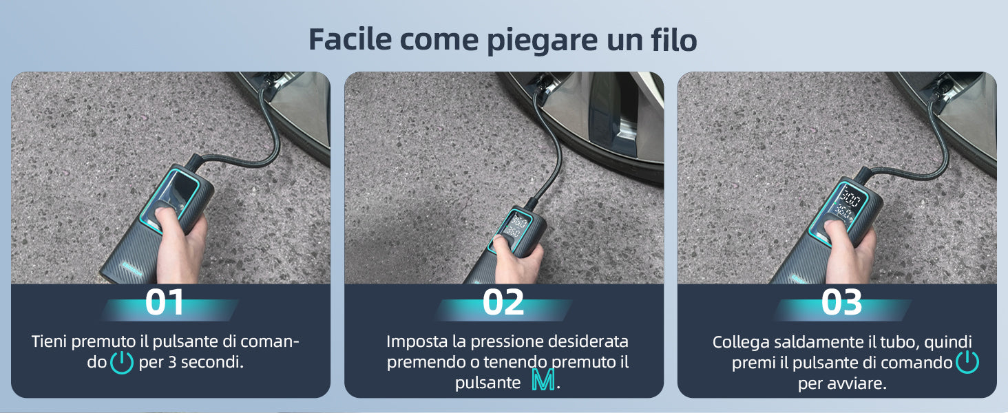 L'indicatore del livello della batteria potrebbe oscillare a causa dell'elevato consumo di energia durante il gonfiaggio. Questo è un comportamento normale per i dispositivi ricaricabili. L'indicatore si stabilizzerà una volta che il gonfiatore non sarà più in uso.
