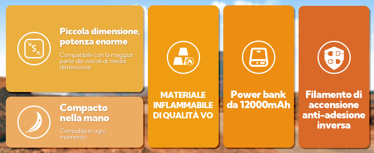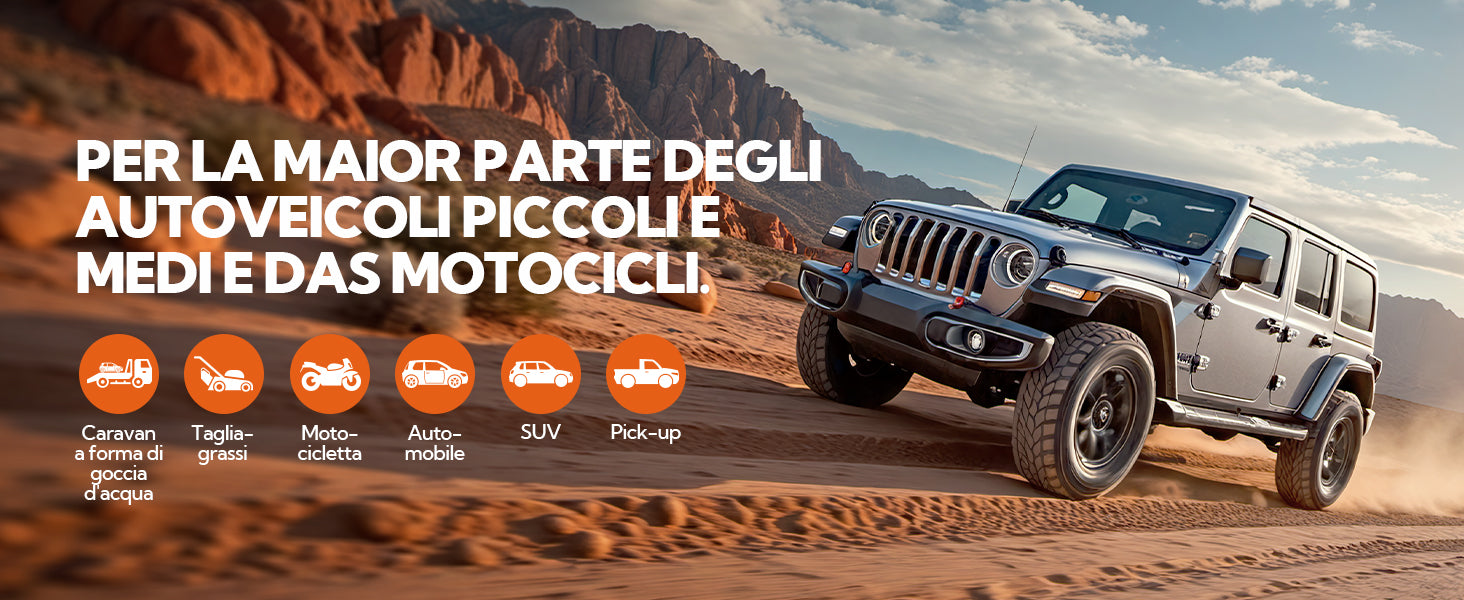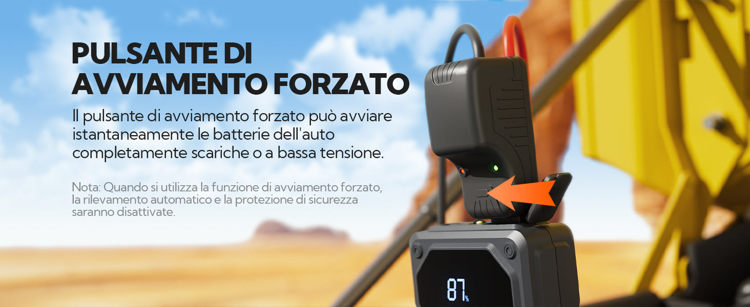 Dotato di una potente batteria da 12000mAh (vera 4*3000mAh, 14,8V), questo avviatore di emergenza è perfetto per veicoli 12V come berline, pick-up, motociclette e alcune tosaerba. I cavi di avviamento dispongono inoltre di un chip intelligente integrato e di un design anti-errato per prevenire i cortocircuiti. Se la batteria è completamente scarica, è disponibile un pulsante di avvio forzato (per i dettagli, si veda il manuale d’uso).
