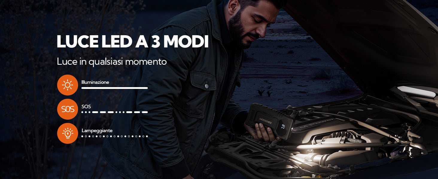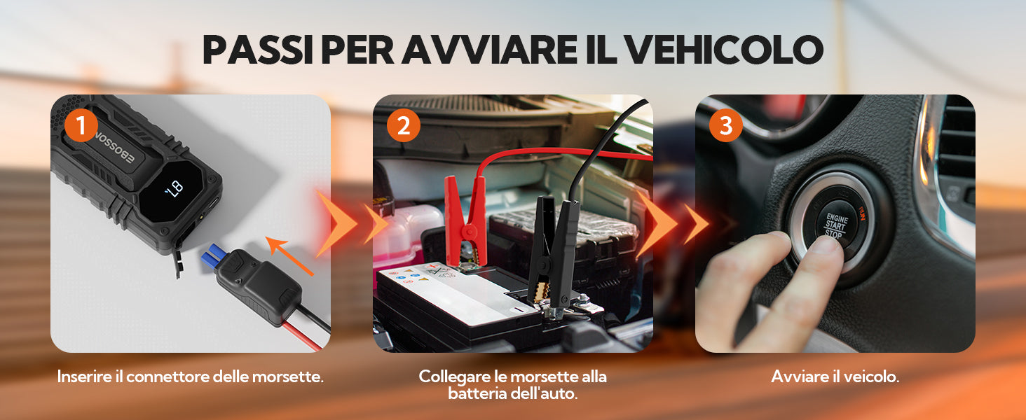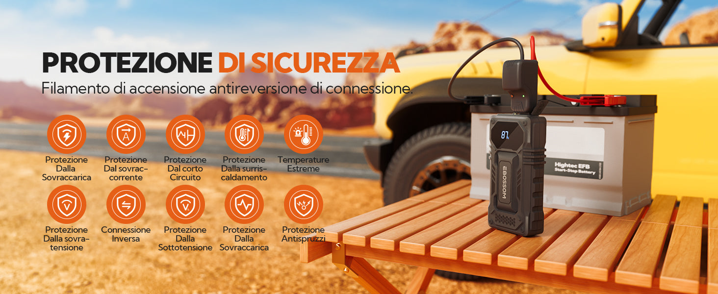 Dotato del Design Anti-errato EBOSSOM. Questo avviatore di emergenza per batteria auto dispone di un cavo di accensione con protezione contro la connessione inversa, oltre a 10+ misure di protezione della sicurezza: protezione da sovracarica, sovracorrente, cortocircuito, surriscaldamento, temperatura estrema, sovratensione, connessione inversa, bassa tensione, sovraccarico e protezione anti-scintille. Con i cavi di avviamento intelligenti, questo booster di avviamento auto ti permette di collegarti in sicurezza a qualsiasi veicolo 12V.