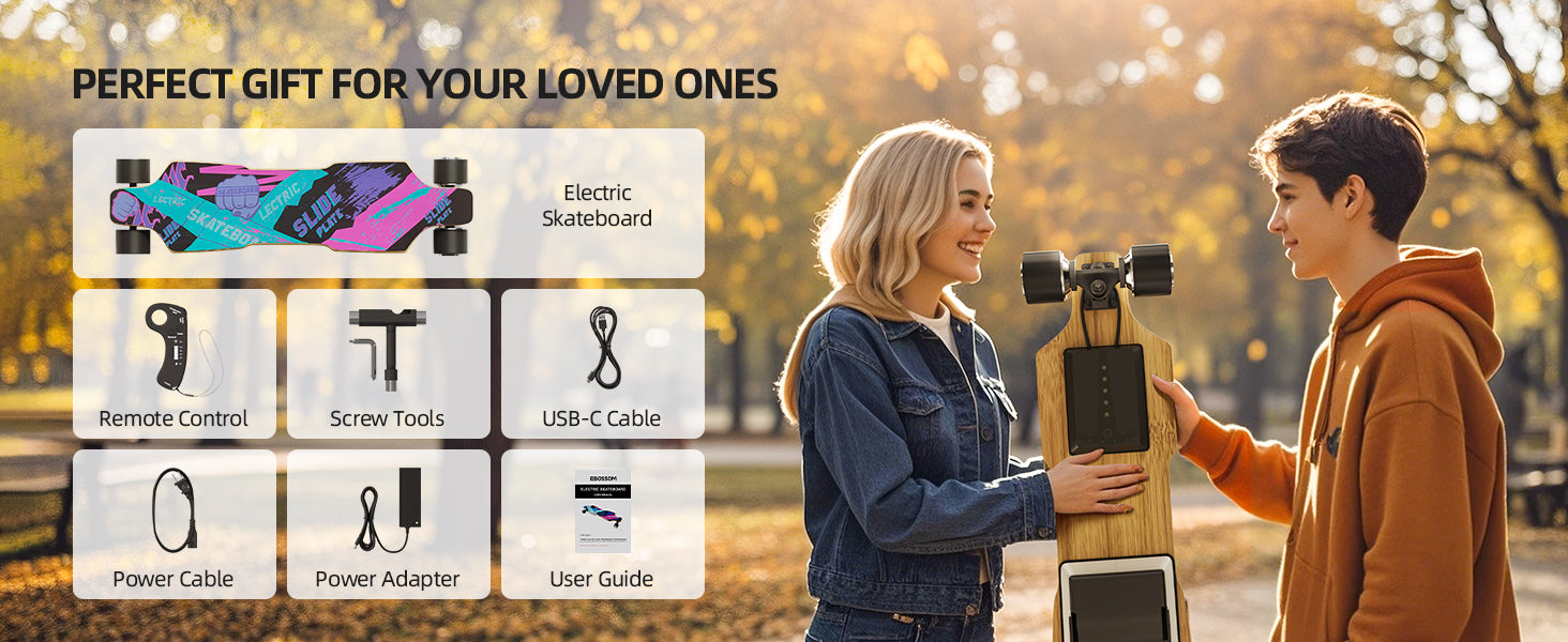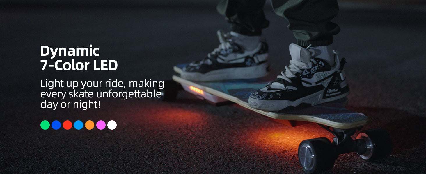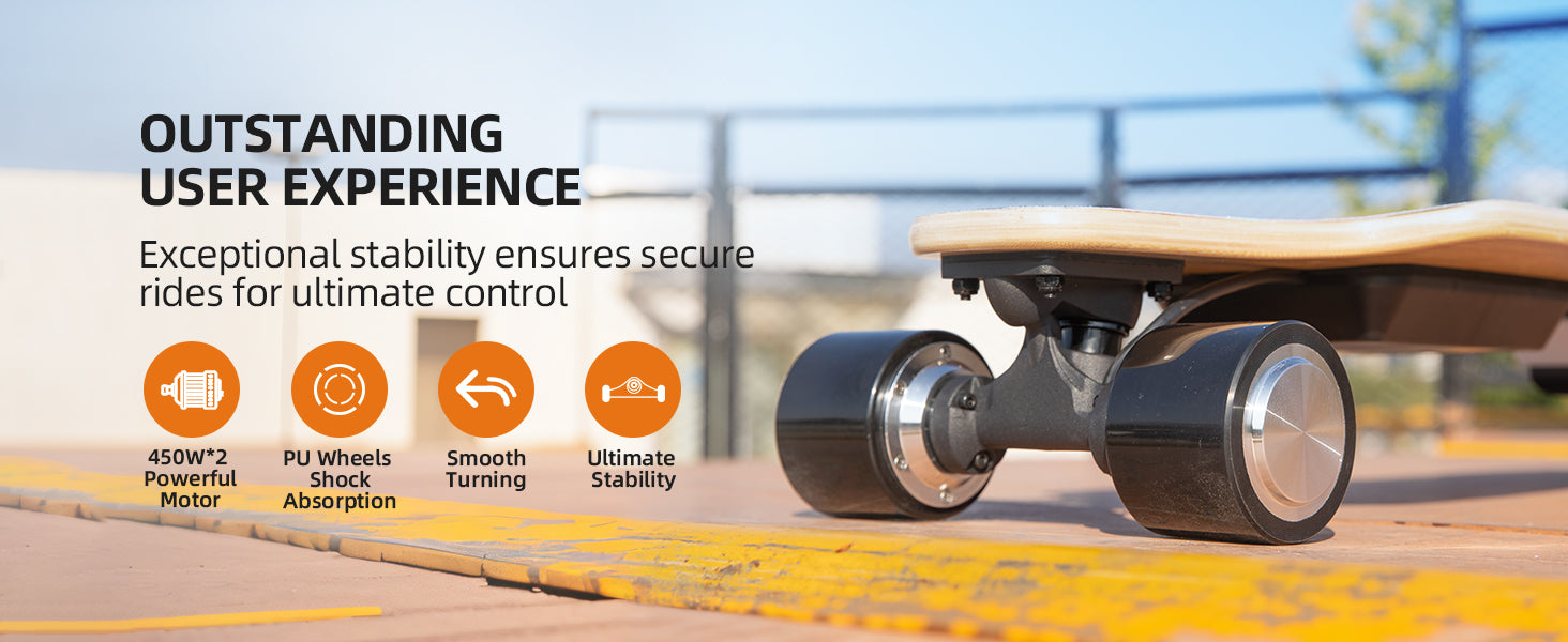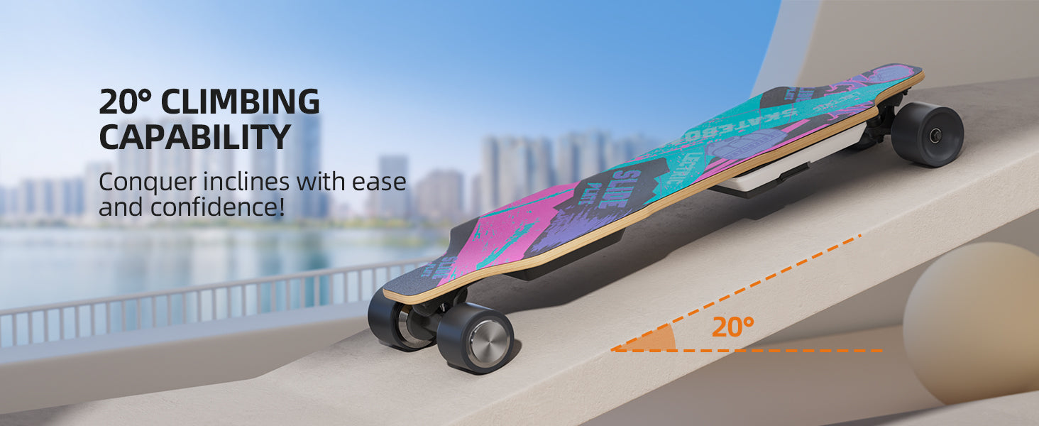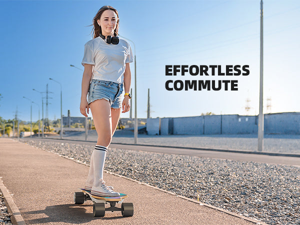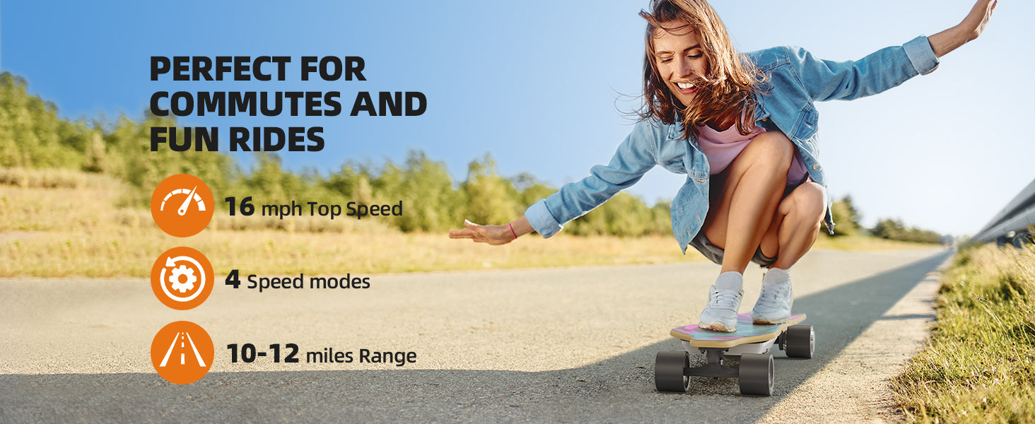 The maximum speed of the electric skateboard is 16 mph. It provides a fun and effortless riding experience, perfect for commuts or cruise. A fully charged electric skateboard can travel up to 10-12 miles, depending on the load and riding conditions.