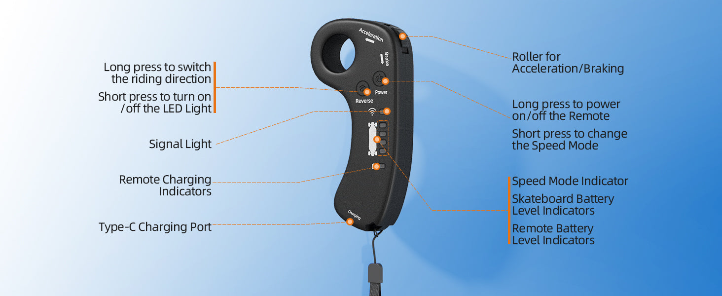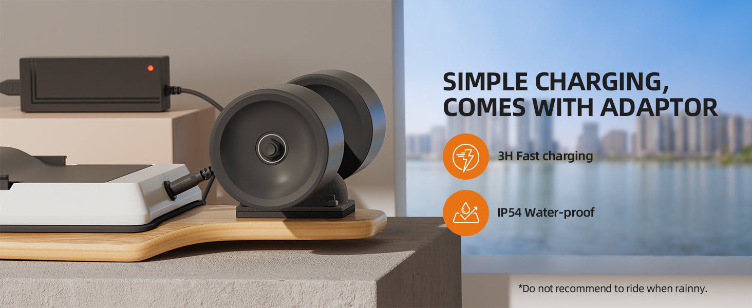 Simply plug the charger into the skateboard’s charging port and connect it to a power source. While charging, the adapter’s indicator light will turn red. When the light turns green, it means the battery is fully charged.
