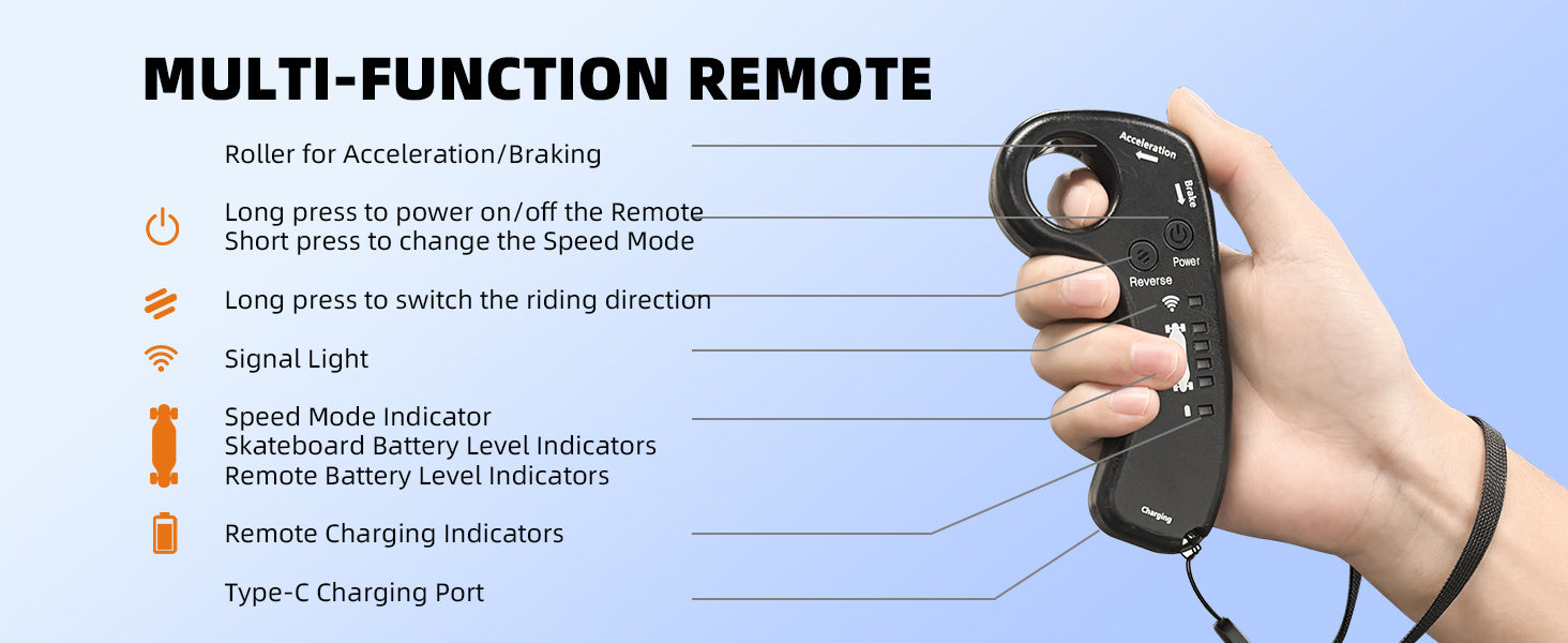 Simply plug the charger into the skateboard’s charging port and connect it to a power source. While charging, the adapter’s indicator light will turn red. When the light turns green, it means the battery is fully charged.
